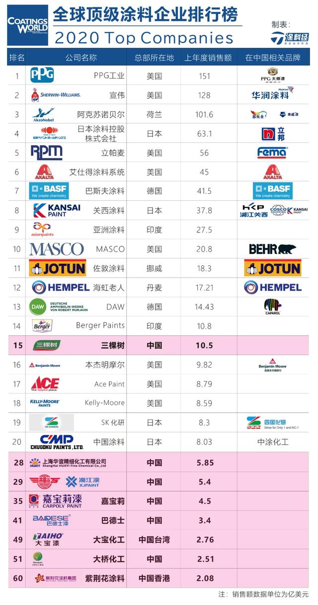 在中國(guó)涂料企業(yè)的表現(xiàn)方面,三棵樹憑借2019年度銷售業(yè)績(jī)的大幅增長(zhǎng),也使得排名得到大幅躍升,以10.5億美元的銷售額排名第15,成為首家躋身全球前20的中國(guó)涂料企業(yè);上海華誼精細(xì)化工有限公司(包含原上海涂料,簡(jiǎn)稱華誼精化)以銷售額5.85億美元排名第28;湘江涂料以5.39億美元排第29名;嘉寶莉以4.50億美元位列第35;巴德士以3.4億美元列第41;大寶化工以2.76億美元列第49;大橋化工以2.51億美元列第51;紫荊花涂料集團(tuán)以2.08億美元列第60。