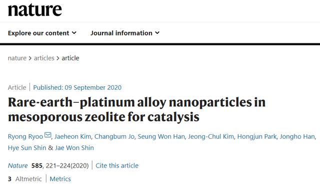 以上研究成果以“Rare-earth–platinum alloy nanoparticles in mesoporous zeolite forcatalysis”為題,于2020年9月9日在線發表于Nature上,韓國基礎科學研究所(IBS)所長Ryong Ryoo教授為文章的第一作者和通訊作者。
