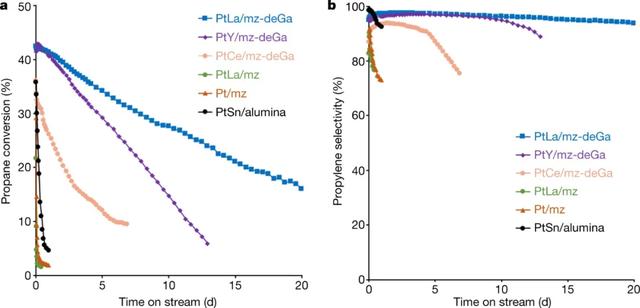 圖2. 介孔沸石負載的Pt-REE合金納米粒子在丙烷脫氫中的催化性能。