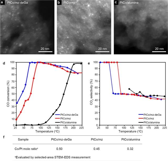 此外,研究人員進一步將該方法擴展為生產由Pt類金屬和REE組成的其他金屬合金,即通過將難以還原的稀土元素(即還原電位低的稀土元素)置于單個原子種類中,可以有效地激活它們以克服能量障礙,從而促進合金納米顆粒的形成。對于PtLa和PtY雙金屬催化劑,REE的還原電位非常低,以至于硅烷醇巢的作用對于金屬合金的形成起決定性作用。而許多其他具有較高還原電位的過渡金屬元素(例如Co,Fe和Zn),在氫氣中加熱摻入的金屬前體時會自發發生合金形成。即使在這種情況下,也可以預期活化物種,通過硅烷醇巢的原子擴散性將過渡金屬元素擴散到附近的Pt納米顆粒上,隨后通過與化學吸附的氫反應而還原為金屬態,從而可以最大程度促進金屬結合到Pt納米顆粒中。進一步經過實驗驗證,相比在沸石載體mz和氧化鋁載體,在脫藻沸石載體上形成的PtCo雙金屬合金催化劑在CO的優先氧化(PROX)反應中表現出更高的催化活性和選擇性(圖3)。以上這些結果不僅證實了使用介孔MFI沸石作為催化劑載體可以形成REE基合金催化劑,而且還適用于具有各種組成和結構的其他過渡金屬基合金催化劑,從而為合成新型高性能合金催化劑提供了新的途徑。
