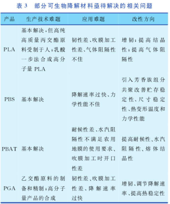 綜上所述,已商品化的 PLA 、PBAT/PBS 的市場(chǎng)前景最好。但是,若要大范圍替代現(xiàn)有通用塑料 PE ,不僅生產(chǎn)成本有待進(jìn)一步降低,而且有賴于一些問題的妥善解決,即提高產(chǎn)品的“ PE特性”。另外,具有獨(dú)特性能的 PGA 的大規(guī)模應(yīng)用也有待相關(guān)問題的解決。