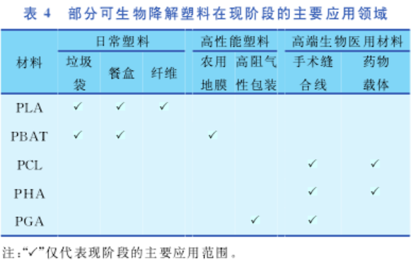 表4是部分可生物降解塑料在現(xiàn)階段的主要應(yīng)用領(lǐng)域。其中,PLA 和 PBAT 主要應(yīng)用于日常塑料,最符合現(xiàn)階段的“限塑”政策需求。根據(jù)國(guó)內(nèi) 2018 年的統(tǒng)計(jì)數(shù)據(jù),我國(guó)一次性塑料制品耗量高達(dá)2000萬(wàn)噸,占國(guó)內(nèi)塑料制品產(chǎn)量的 33%。